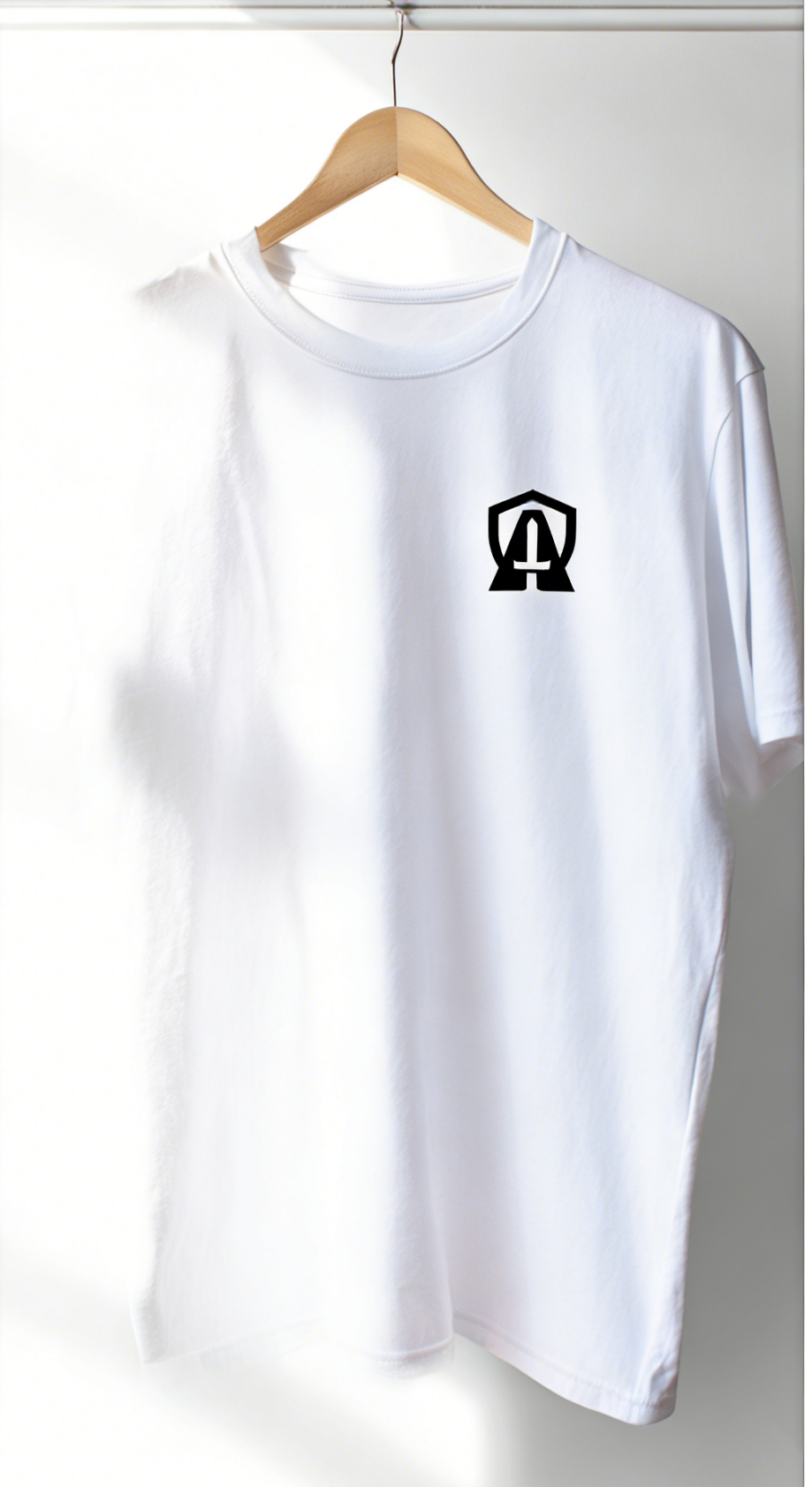“Minimalist white cotton t-shirt mockup with a bold black brand logo centered on the chest, soft natural lighting, clean white background, professional product photography style, consistent brand colors (navy blue and white)